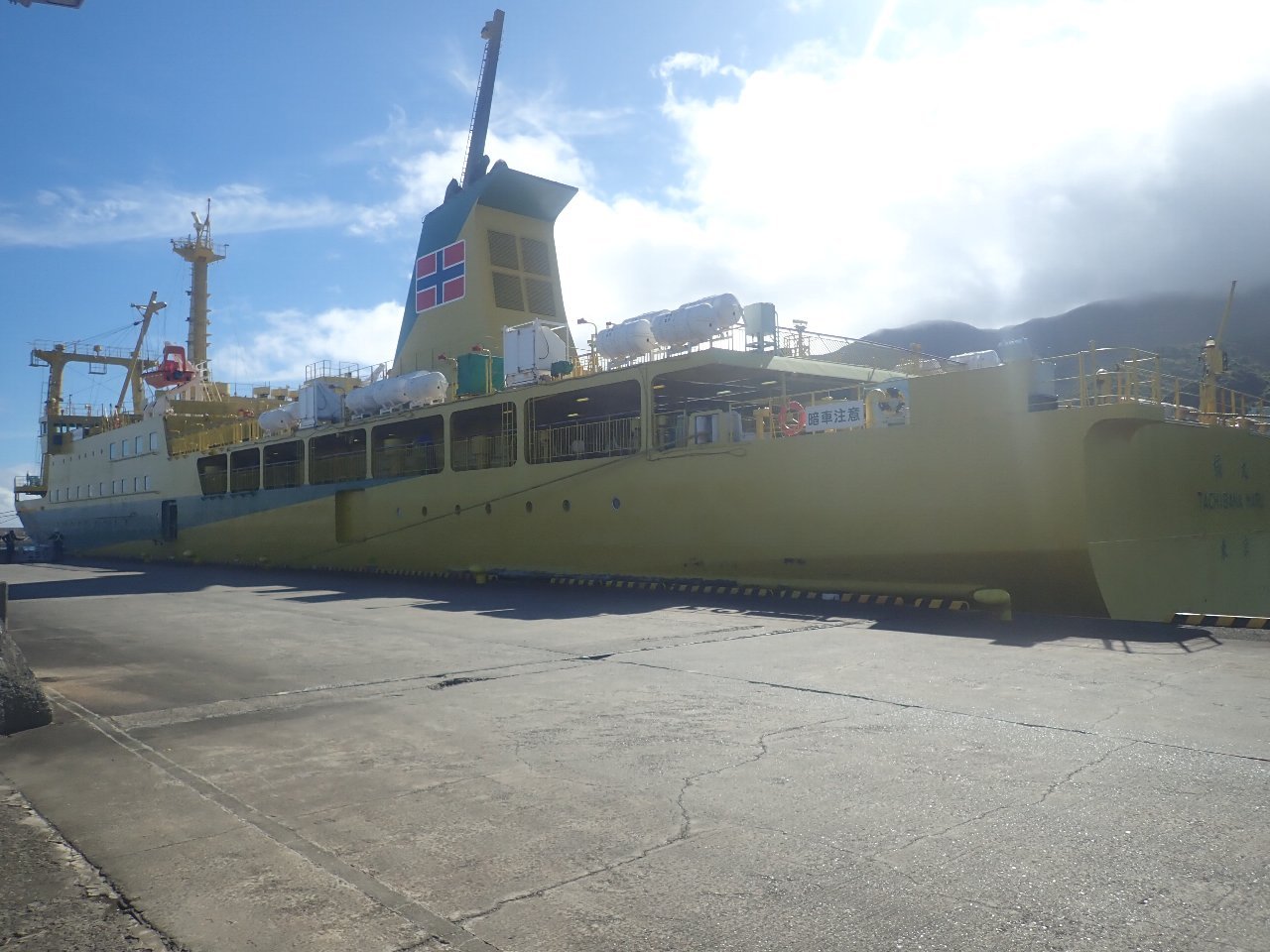 | 八丈島が見えてきました。大きい島なので向かっている船から全体はなかなか見えません。左が三原山、真ん中が八丈富士、右が八丈小島でしょうか。 | 島の様子が分かるまで近づいてきました。正面に見える港が底土港のようです。予報は悪かったので、思ったより良い天気で安心しました。 | 出発の時にはよく見えませんでしたが、乗ってきた船がこれです。ずっと前に三宅島に来たときより大きな船になり、あまり揺れませんでした。 |