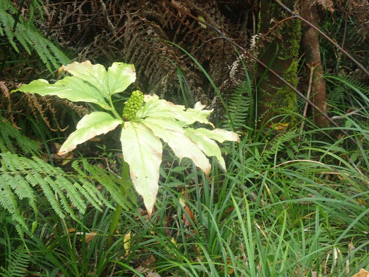 | 花が終わった後のハチジョウショウマです。アカショウマの変種です。 | ハチジョウテンナンショウの実はまだ赤くなっていません。 | 見事な花をつけていたのはシュスランでした。数株ですが花盛りでした。 | |